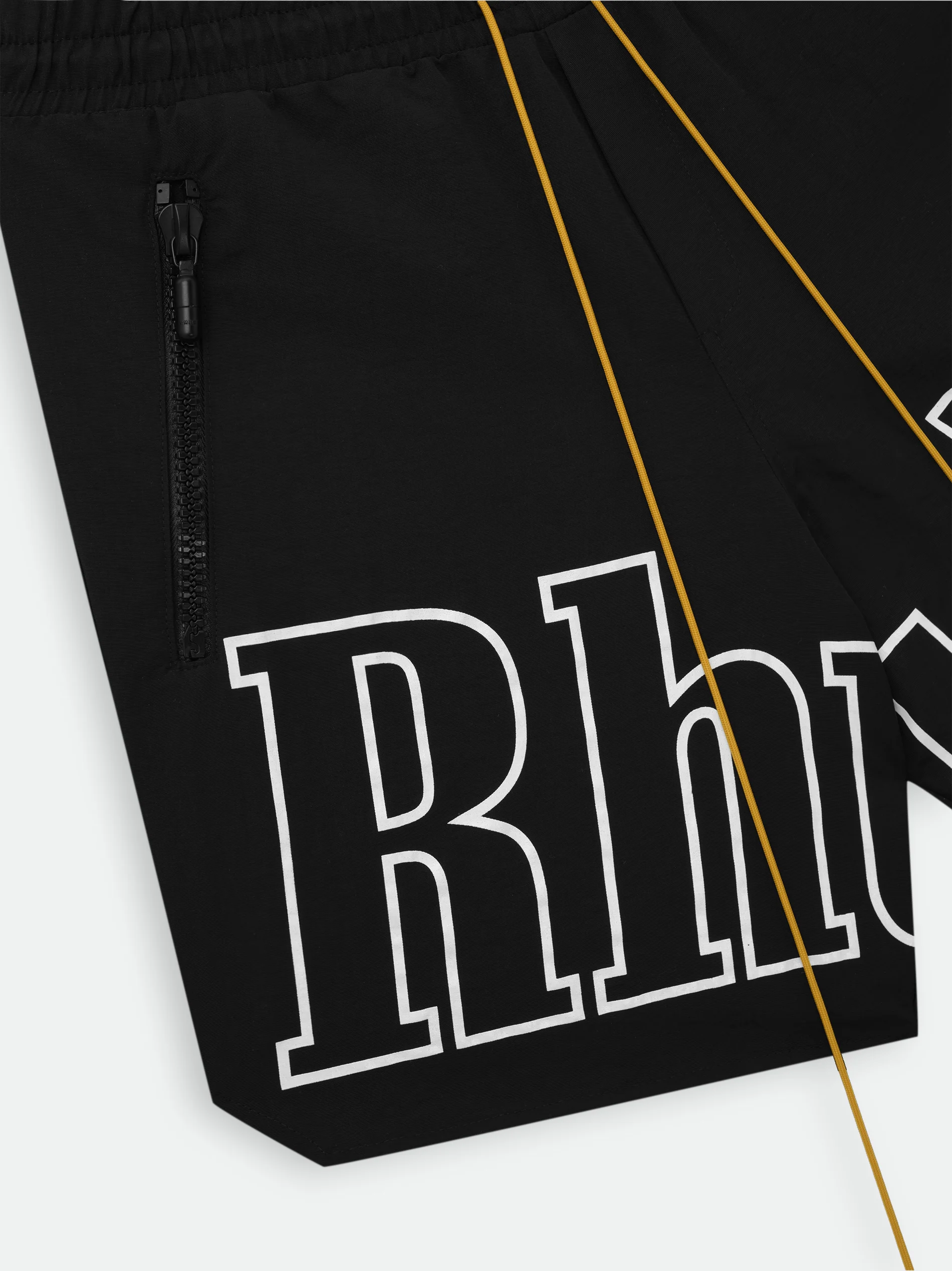 Premium washed nylon short with logo print across front legs. Twin zipper pockets with matching tonal Rhude Pill hardware. Extended drawstrings in our signature mustard tone.