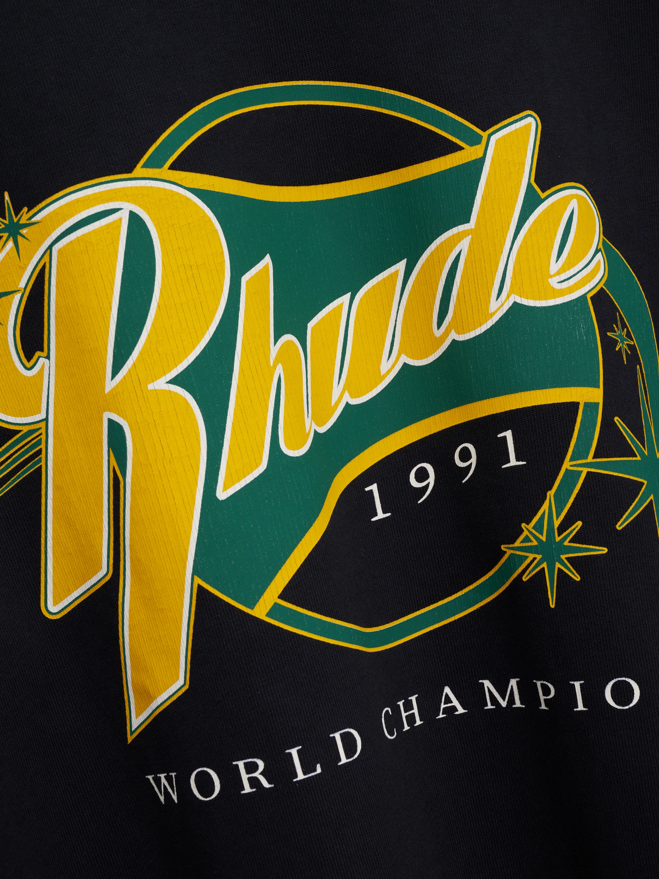 Custom-fit vintage wash cotton short sleeve tee-shirt with Rhude "World Champions" graphics printed at front, with a clean back.