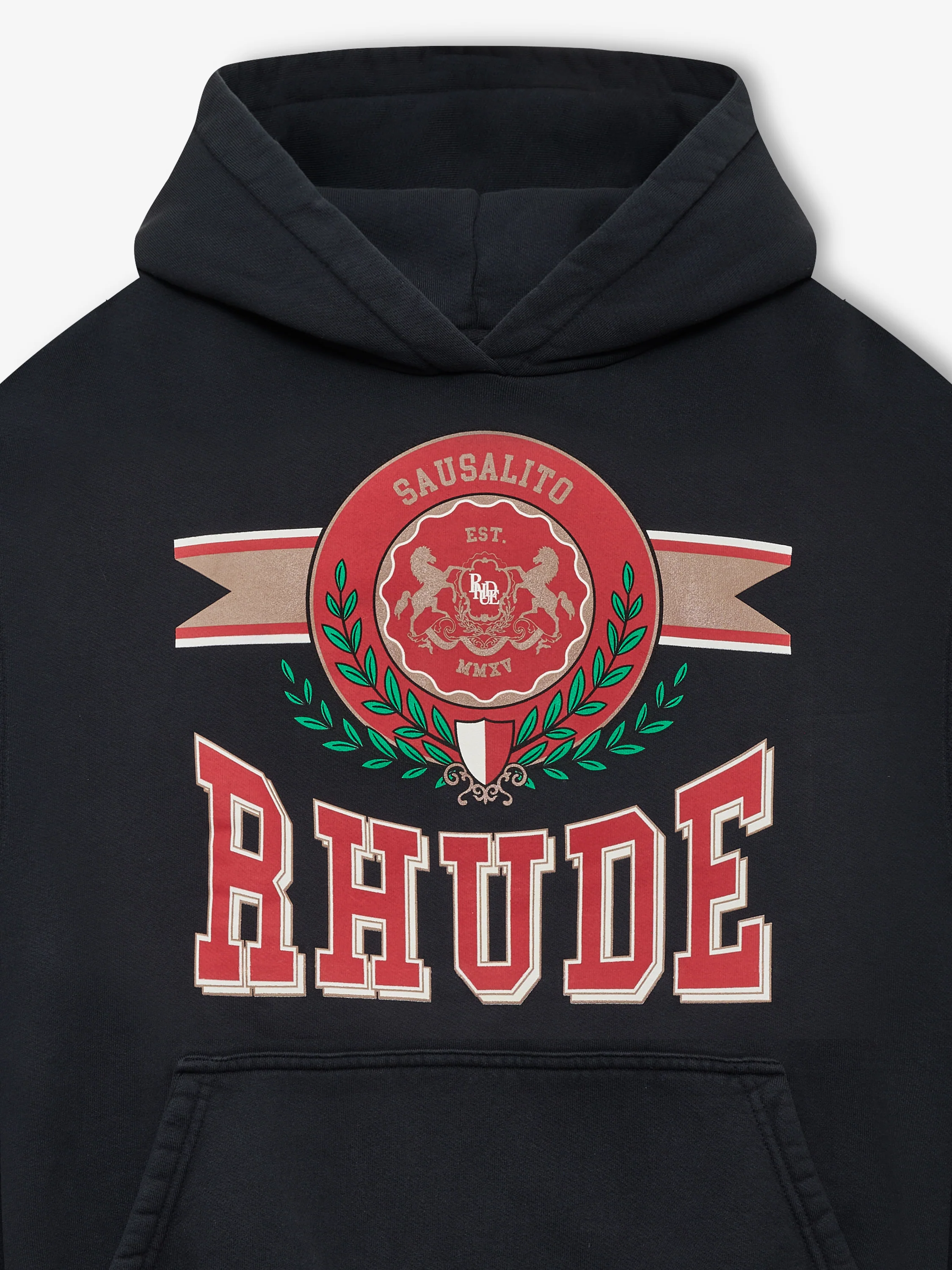 Long sleeve cotton heavyweight hoodie with Rhude "Sausalito Crest" graphic designs printed on the front, with a clean back. Featuring a kangaroo front pocket and dropped shoulders. Each piece is unique and print distressing my vary per style.
